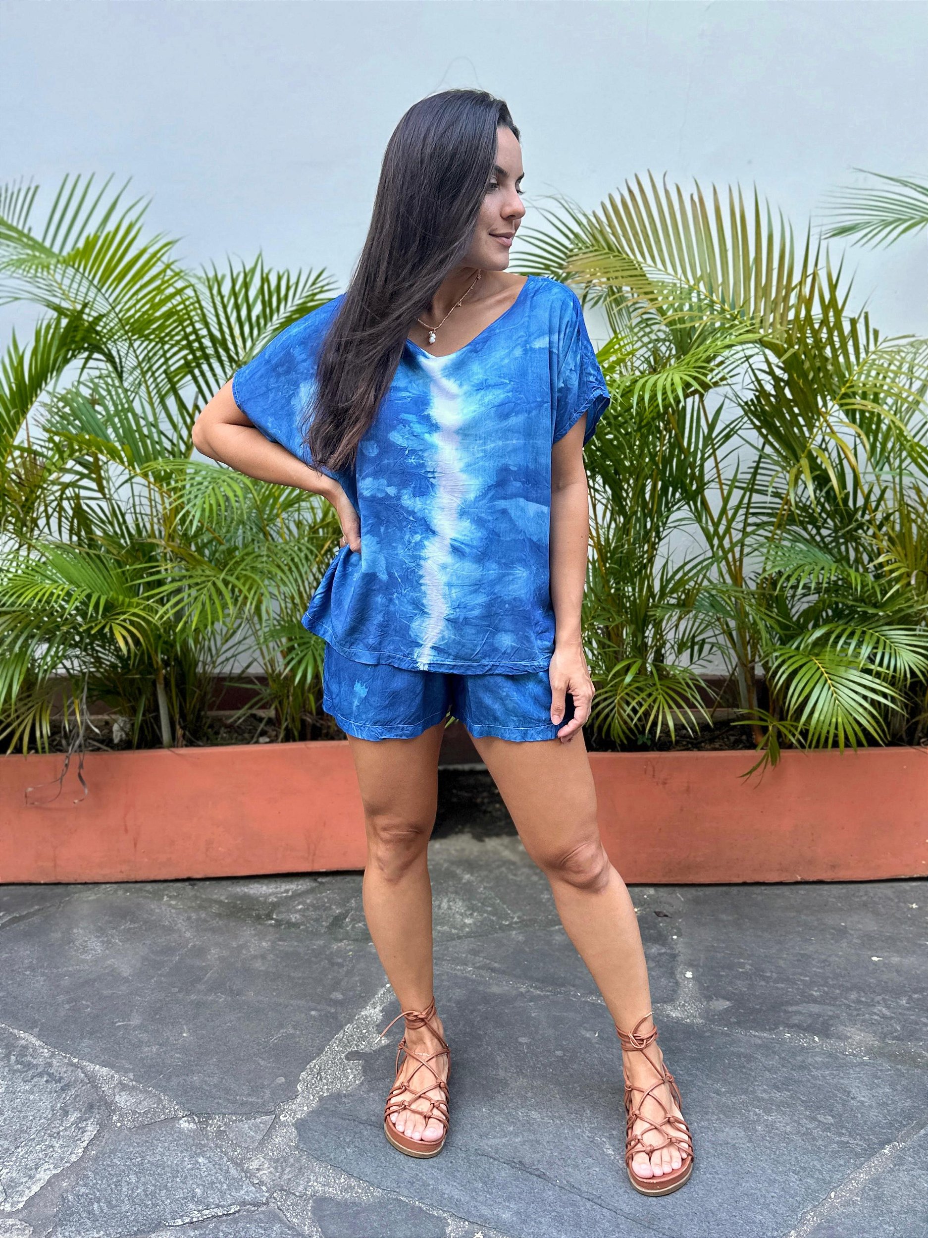 O conjunto Mia é confeccionado numa base de 100% viscose.A blusa é modelo quadrado com tintura manual em duas cores azul bic e branco.O short é de elástico ajustável ao corpo com o tie dye igual da blusa.