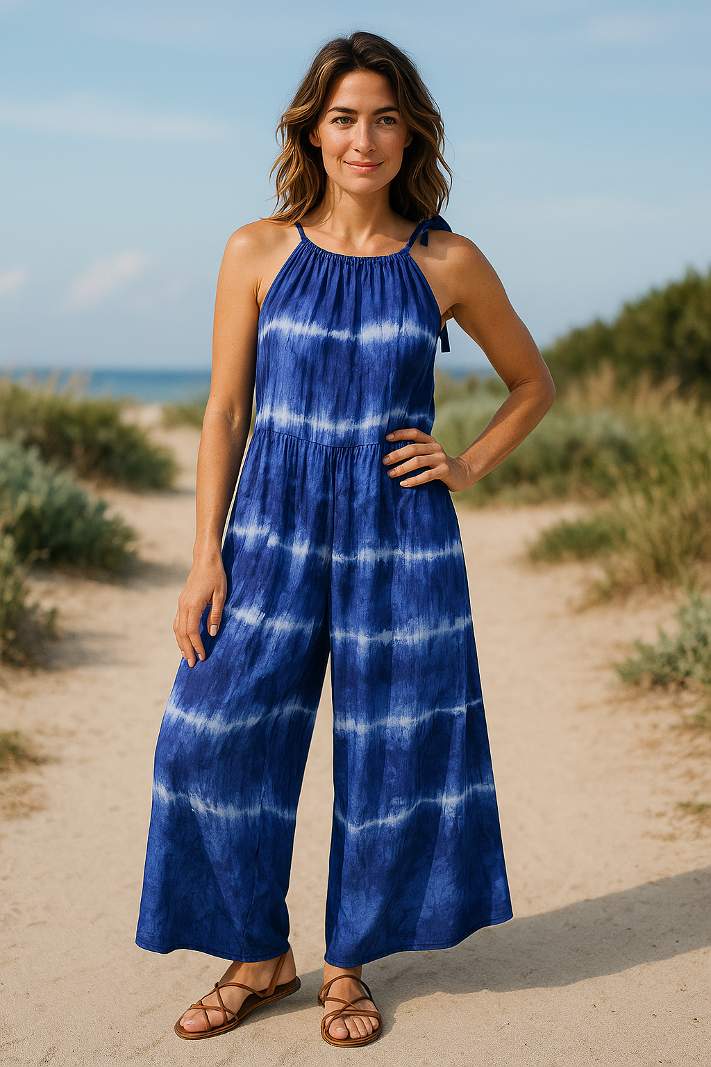 O macacão Geribá é confeccionado numa base de 100% viscose. Com alças amarrando na lateral. O corpo da peça possui volume e fluidez e frente e costas igual. Ele é tinturado manualmente em listras horizontais.