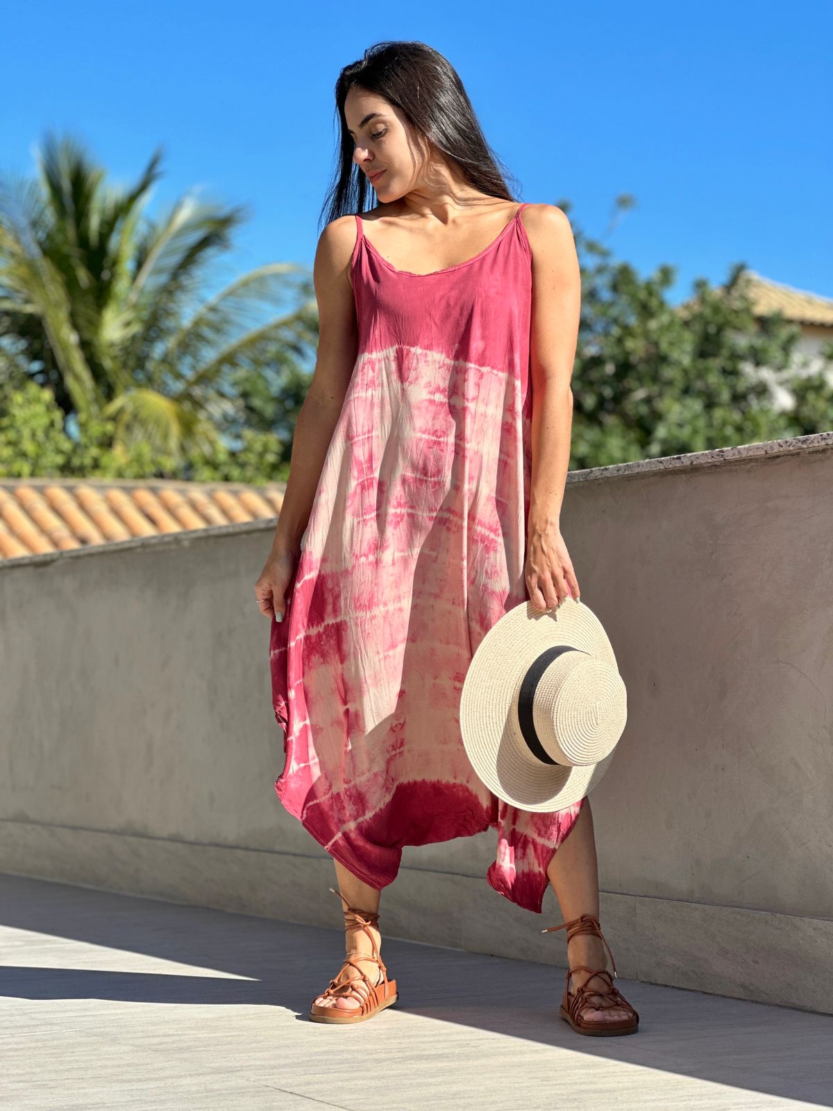O macacão Saruel shuri é confeccionado numa base de 100% viscose, tem abertura nas laterais e não tem gancho. Possui tintura manual em tie dye listras na horizontal.