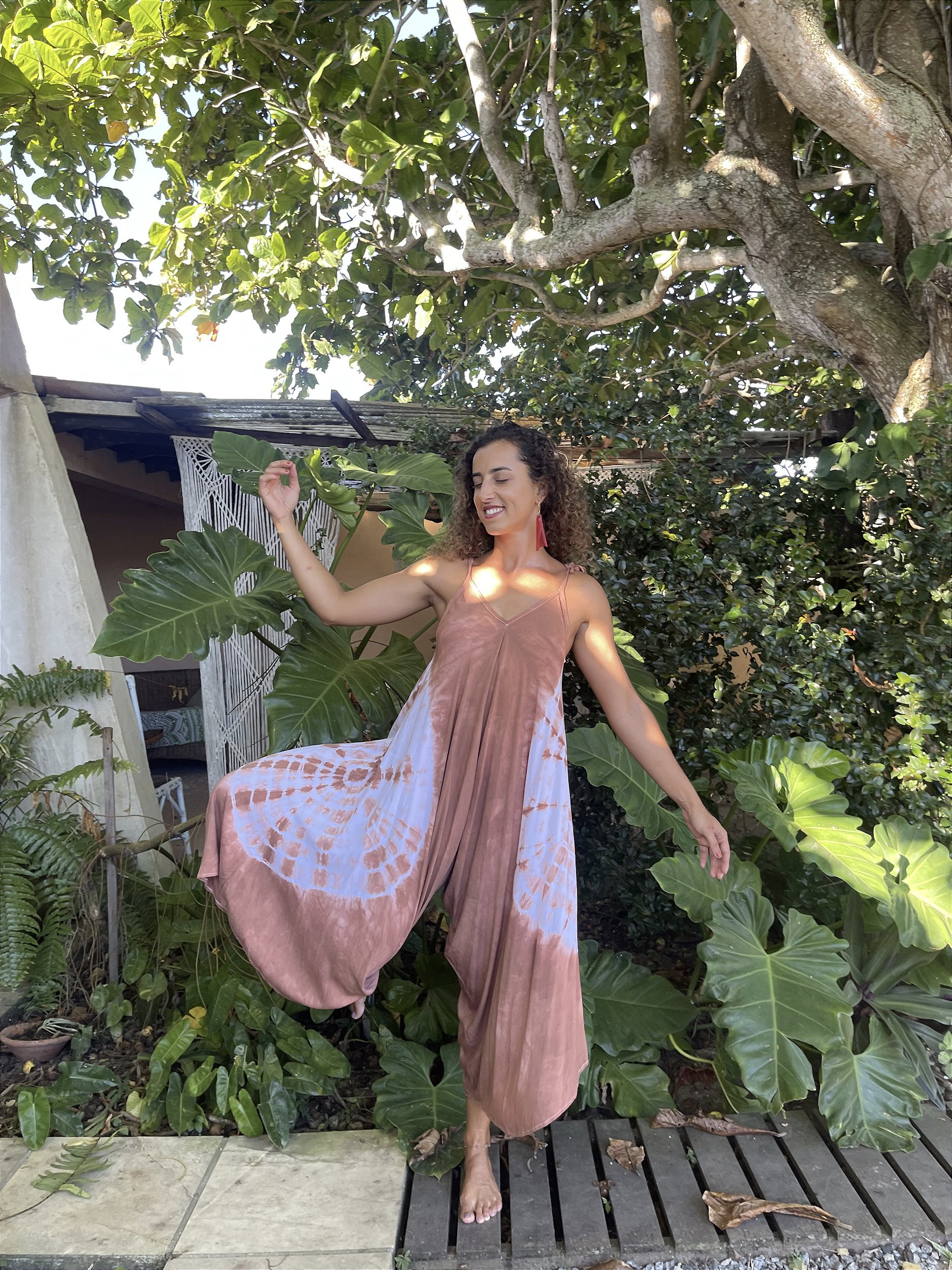 Macacão Saruel Flow é confeccionado numa base de 100% viscose. Possui tintura manual em tie dye.