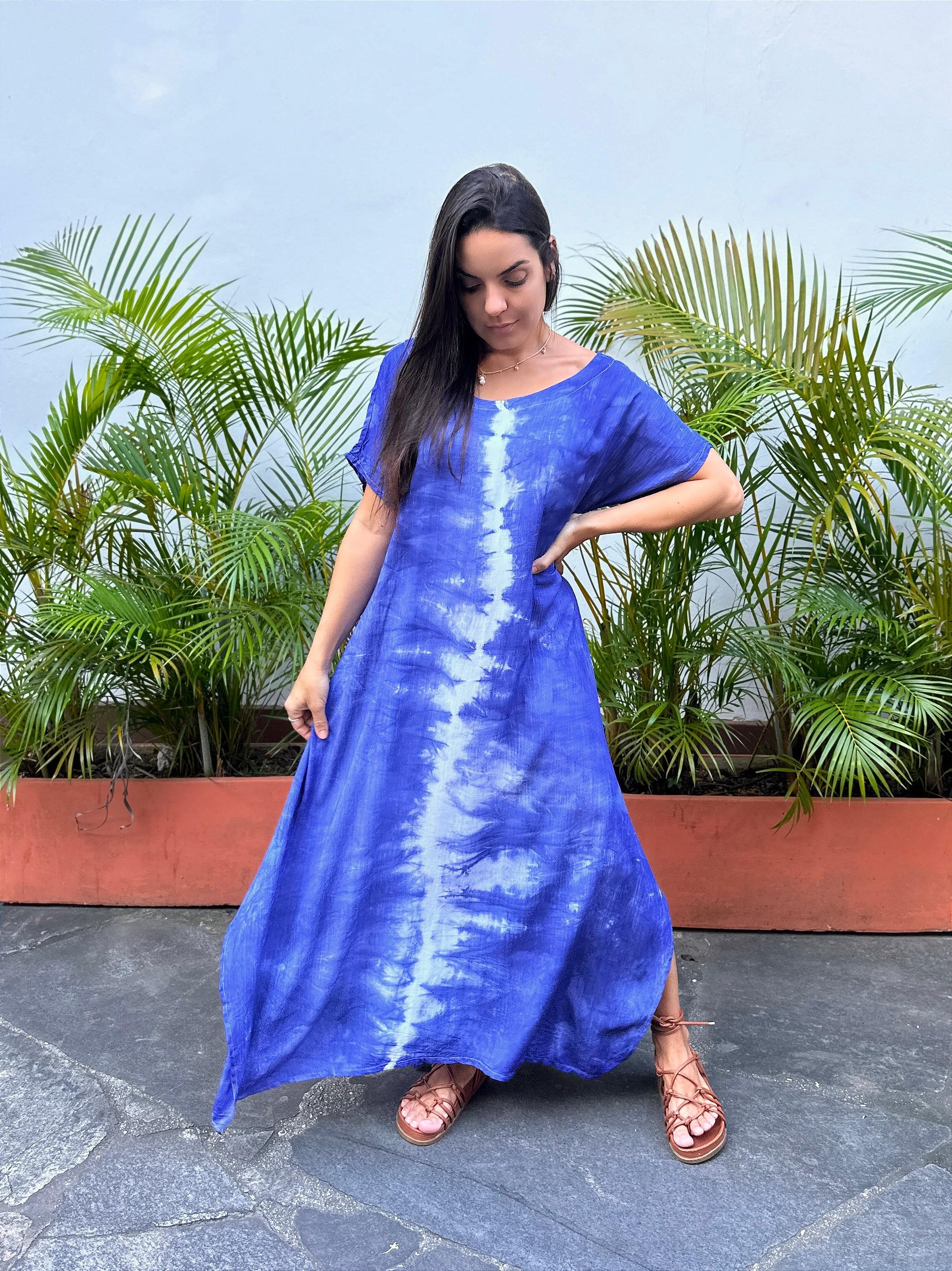 O Vestido Lola é confeccionado numa base 100%viscose na cor azul bic com branco. Possui modelagem fluída abertura lateral decote canoa e manga japonesa.O Vestido tem tintura manual em tie dye azul bic e branco.